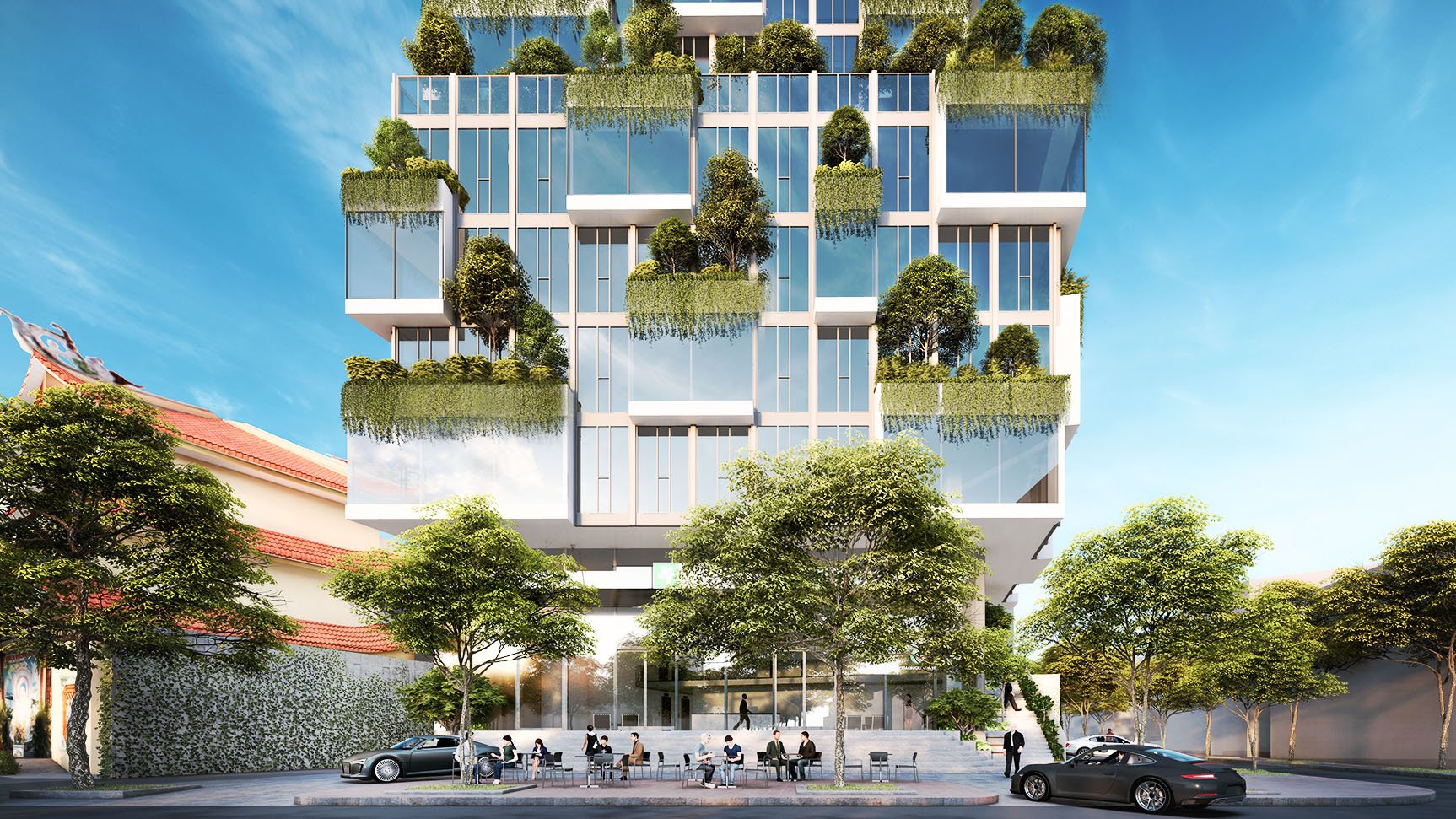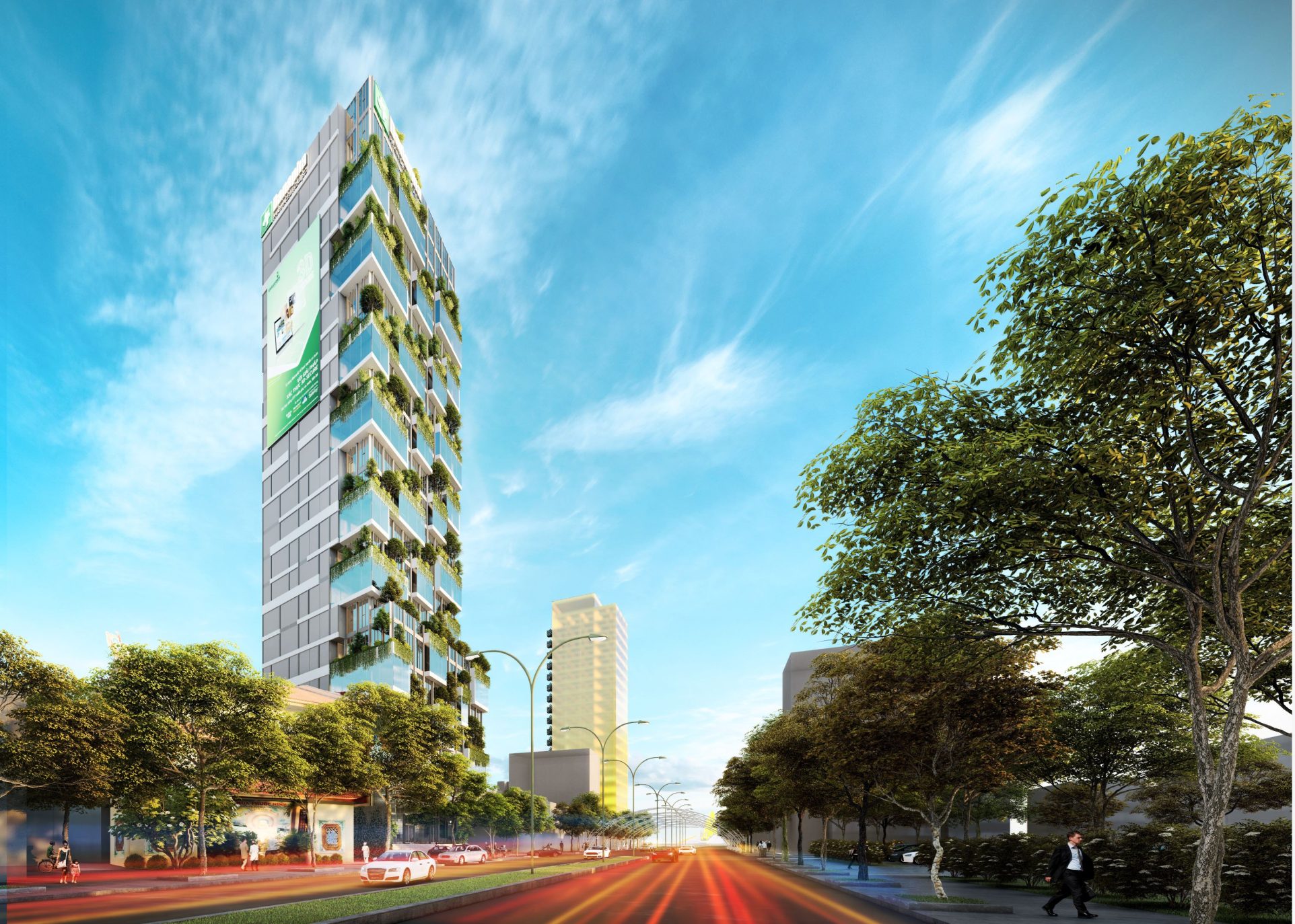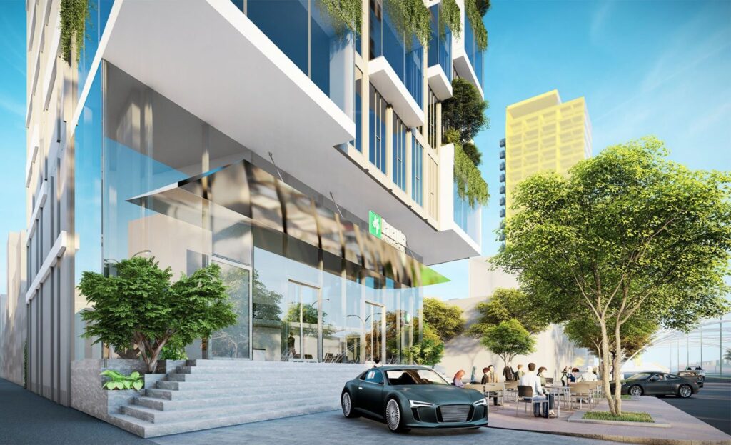 Tầng trệt của tòa nhà gồm không gian Lễ tân, cafe, phòng kỹ thuật và các chức năng phục vụ khác. Công trình được Hoàng Nhật Anh Architects & HAS Architecture thiết kế như một lõi xanh giữa lòng thành phố, mang gam màu ấn tượng sẽ là điểm nhấn trên trục đường thuộc diện đẹp nhất của thành phố ven sông Hàn.